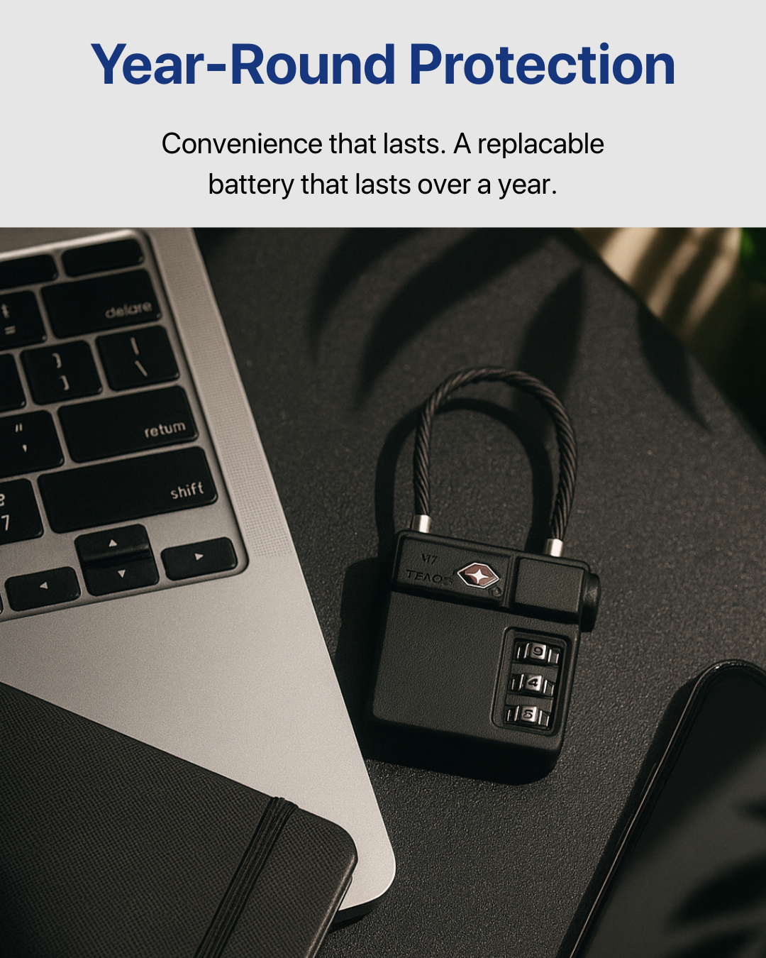 Over a year. The Smart Lock includes a replaceable battery that keeps working through multiple trips. When it's time for a fresh one, just pop in a new battery in seconds—it's that simple. No waiting for it to charge or dealing with built-in batteries that can't be replaced.